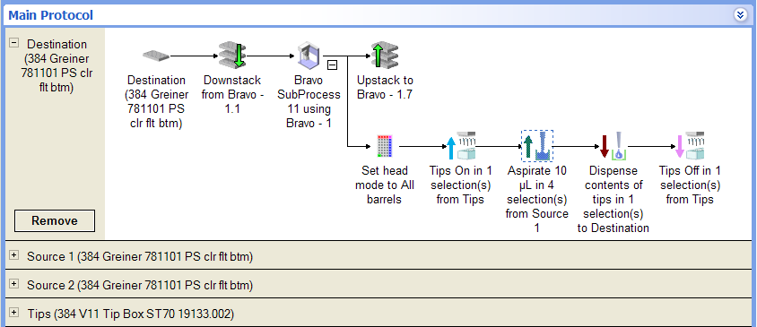 • The destination microplates are at Bravo deck location 1.In the Destination plate process, a Bravo subprocess is added. Within the subprocess, an Aspirate task and a Dispense task are added as shown in the following example.