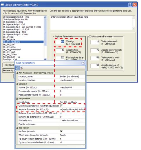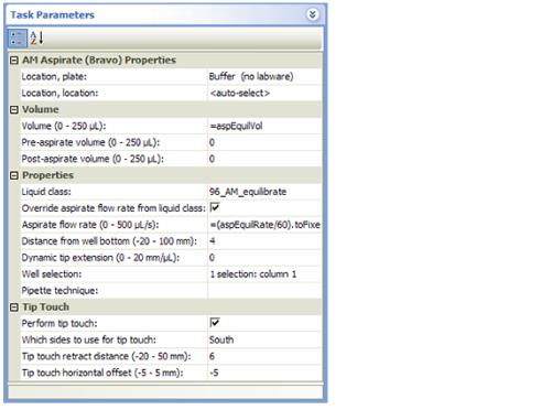 Bravo Platform with Bravo 96AM Head Main Protocol, Bravo SubprocessThe AM Aspirate (Bravo) task has the same task parameters as the Aspirate (Bravo) task, except for the following parameters:Precise flow-rate control is critical for the performance of the AssayMAP Bravo cartridges. The option to override the aspirate flow rate (velocity) in the liquid class enables an operator to change the flow rate from experiment to experiment for rapid method development without modifying the liquid class. Likewise, the flow rate can vary for different AM Aspirate tasks that use the same liquid class in a given protocol.