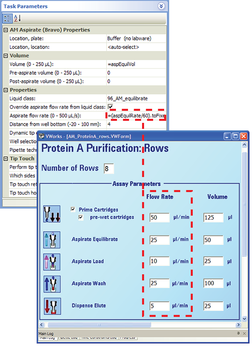 5 Example: Allowing an operator to change the aspirate flow rate using an edit control on a VWorks formIn the protocol, the AM Aspirate task is added. In the task parameters, the Override aspirate flow rate from liquid class check box is selected, and the Aspirate flow rate is specified as a variable, for example =AspFlowRate.In the VWorks form, an edit control is added for the aspirate flow rate using the =AspFlowRate variable. The operator can enter values within a specified range in the form and run the protocol using the form. For details on how to design VWorks forms to run protocols, see Creating protocol forms for operators.