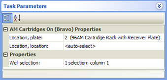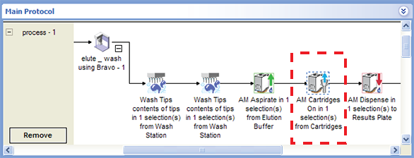 AssayMAP Bravo cartridges are pressed on using the AM Cartridges On task. An AM Dispense task is used to dispense the elution buffer through the cartridges into a results plate.