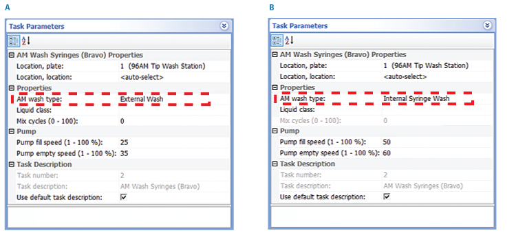 CAUTION Ensure that the labware definition for the 96AM Wash Station is accurate and the teachpoint for the location is precise so that the system can position the syringe probes or cartridge tips at the correct location. Otherwise, a potential collision can occur, which can damage the syringes and the 96AM Wash Station.The software automatically selects all the chimneys in the wash station (entire plate) for the well selection and sets the volume and other properties. The following figure shows the AM wash type parameter: (A) External Wash or (B) Internal Syringe Wash.