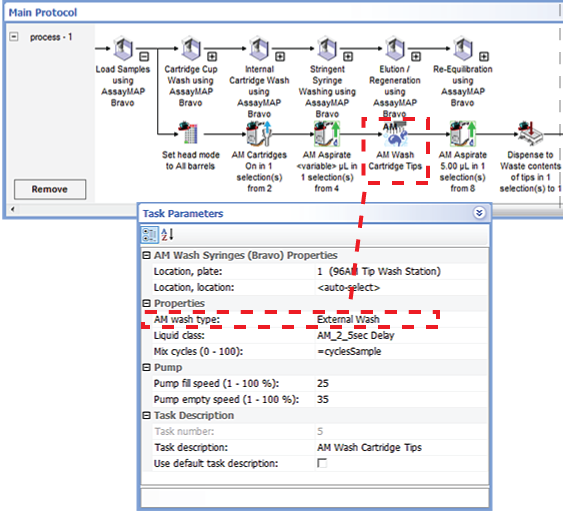 Bravo Platform with a Bravo 96AM Head and an autofilling station Main Protocol, Bravo SubprocessIn Bravo Diagnostics, ensure that the 96AM Wash Station is set up at the correct deck location and associated with a Pump Module.Ensure that the protocol has a configured labware for the 96AM Wash Station in addition to the other processes and configured labware required by the protocol.After adding the AM Wash Syringes task at the desired point in the protocol, you set the parameters in the Task Parameters area.