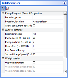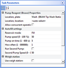 ) tasks fill or empty the Auto Filling Reservoir and Tip Wash Station (also known as MicroWash Reservoir) by pumping for a specified number of seconds or until the percent of maximum tared weight is reached. If the reservoir is on a Weigh Station or Weigh Shelf, the pump stops fluid flow when the target weight is reached. Otherwise, gravity drain is used to empty the reservoir.