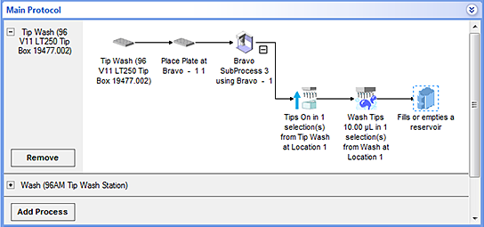 • Example: Fill the Tip Wash Station after the Tip Wash taskAfter some liquid-handling tasks, wash the tips, and then fill the Tip Wash Station.In Bravo Diagnostics, set up the Auto Filling Reservoir on a deck location. Associate the reservoir with one or more pump modules.In the Bravo subprocess where the liquid-handling tasks are specified, a Pump Reagent task is added after the Wash Tips task. After adding the Pump Reagent task, the task name changes to Fill or empty a reservoir in the protocol, as shown in the following example.