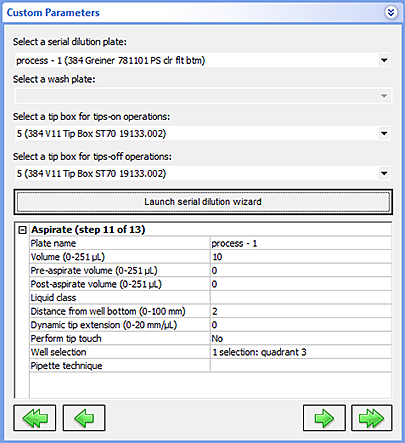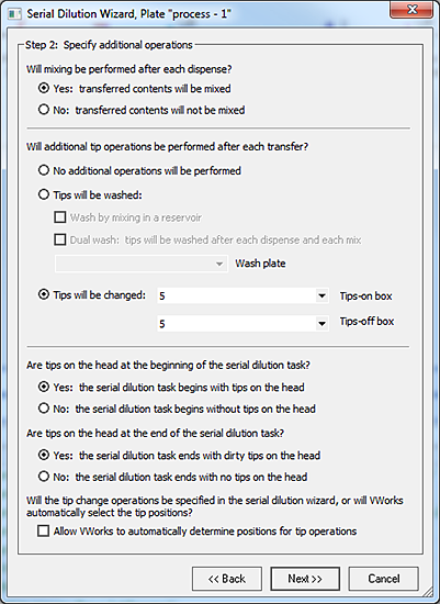 Available only if the Tips will be washed option is selected in the wizard. The reservoir involved in the wash. Available only if the Tips will be changed option is selected in the wizard. The tip box involved in the Tips On operation. Available only if the Tips will be changed option is selected in the wizard. The tip box involved in the Tips Off operation. Note: The remaining task parameters will be filled in after you go through the Serial Dilution wizard.