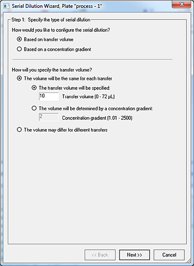 For example, if the concentration gradient is 2, then the concentration of the first dilution will be the concentration in the starting column C1 divided by 2, or C1/2. The concentration of the second dilution will be the concentration of the second column C2 divided by 2, or C2/2, and so on.Note: If you select Based on a transfer volume, The volume will be determined by a concentration gradient option is not available.