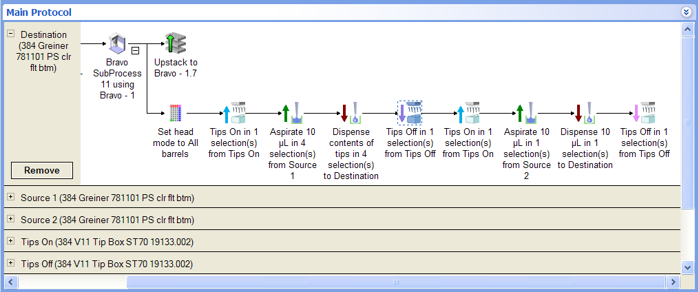 Main Protocol, Bravo Subprocess Main Protocol, Vertical Pipetting Station SubprocessOptions in the Tips On and Tips Off tasks permit tracking of pipette tip usage during and across protocol runs. In addition, an option in the Tips Off task allows you to reuse pipette tips for a portion of the protocol run. If the Bravo Platform is configured with a trash accessory, you can discard of used pipette tips at the trash location.In addition to selecting the tracking option in the Tips On and Tips Off tasks, you must also turn on the tracking in the Serial Dilution Wizard. For more detailed information, see Serial Dilution (Bravo, Vertical Pipetting Station).If you want to track pipette tip usage across different protocols that contain Bravo and Vertical Pipetting Station Subprocesses, make sure:Note: The task parameters for Tips Off (Bravo) and Tips Off (Vertical Pipetting Station) are similar.After adding the Tips Off task at the desired point in the protocol, set the following parameters in the Task Parameters area:
