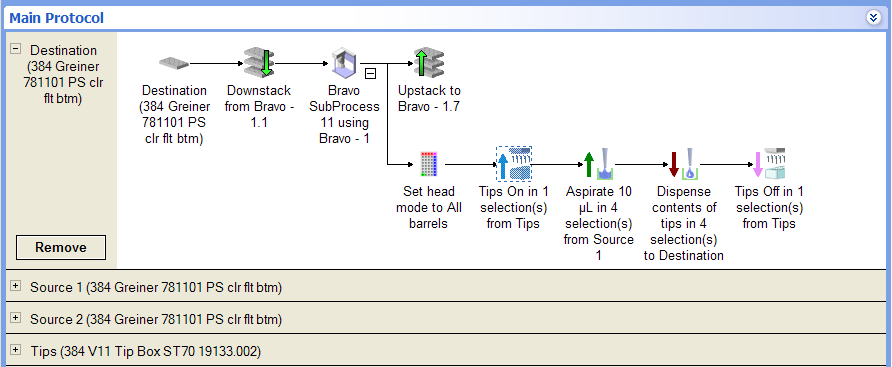 Main Protocol, Bravo Subprocess Main Protocol, Vertical Pipetting Station SubprocessIn addition to selecting the tracking option in the Tips On and Tips Off tasks, you must also turn on the tracking in the Serial Dilution Wizard. For more detailed information, see Serial Dilution (Bravo, Vertical Pipetting Station).If you want to track pipette tip usage across different protocols that contain Bravo and Vertical Pipetting Station Subprocesses, make sure:After adding the Tips On task at the desired point in the protocol, set the following parameters in the Task Parameters area: