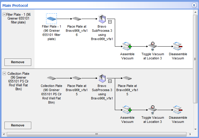 On the Bravo Platform, assemble a Vacuum Filtration Station whose configuration is Base–Collection plate–Filter plate–Collar. Filter for 30 seconds. Disassemble the station.