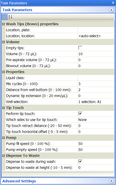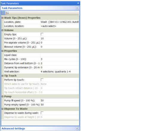 • Tip Wash Station (also known as MicroWash Reservoir)Note: The task parameters for Wash Tips (Bravo) and Wash Tips (Vertical Pipetting Station) are identical.After adding the Wash Tips task at the desired point in the subprocess, set the following parameters in the Task Parameters area: