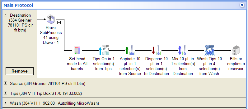 • Less than 0. Tips move a distance less than the radius of the well, resulting in a lighter tip touch. In Bravo Diagnostics, set up the Tip Wash Station on a deck location. Associate the reservoir with one or more pump modules.In the protocol, add a configured labware for the Tip Wash Station in addition to the other processes and configured labware required by the protocol. In the example shown, the configured reservoir is called Wash.In the Bravo subprocess where the liquid-handling tasks are specified, a Wash Tips task is added at the end of a cycle of liquid-handling tasks.