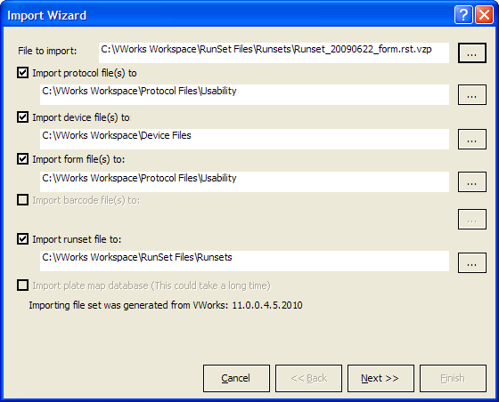 4 When you are finished, click Finish. The files are imported in the specified locations. If you selected the option, the imported protocol opens in the VWorks window.
