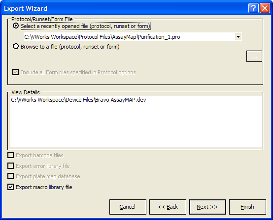 • Select the Export macro library file check box to export the macro library information for those macros from the protocol that are also in the macro library. After the .vzp file is imported, this set of macros can be added to the macro library on the destination computer.