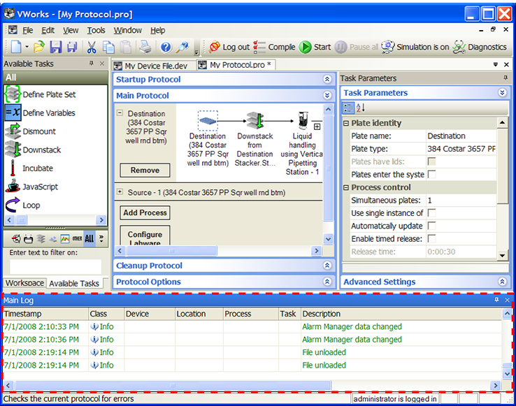 • VWorks log fileViewing the Main Log in the VWorks windowTo view the Main Log in the VWorks window: