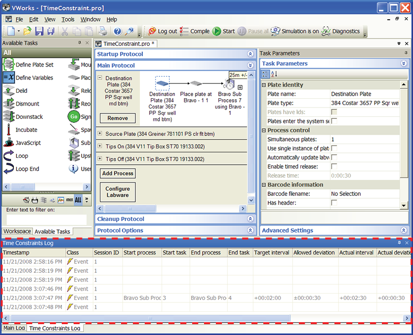 • VWorks time constraint log fileViewing the Time Constraints Log in the VWorks windowTo view the Time Constraints Log in the VWorks window: