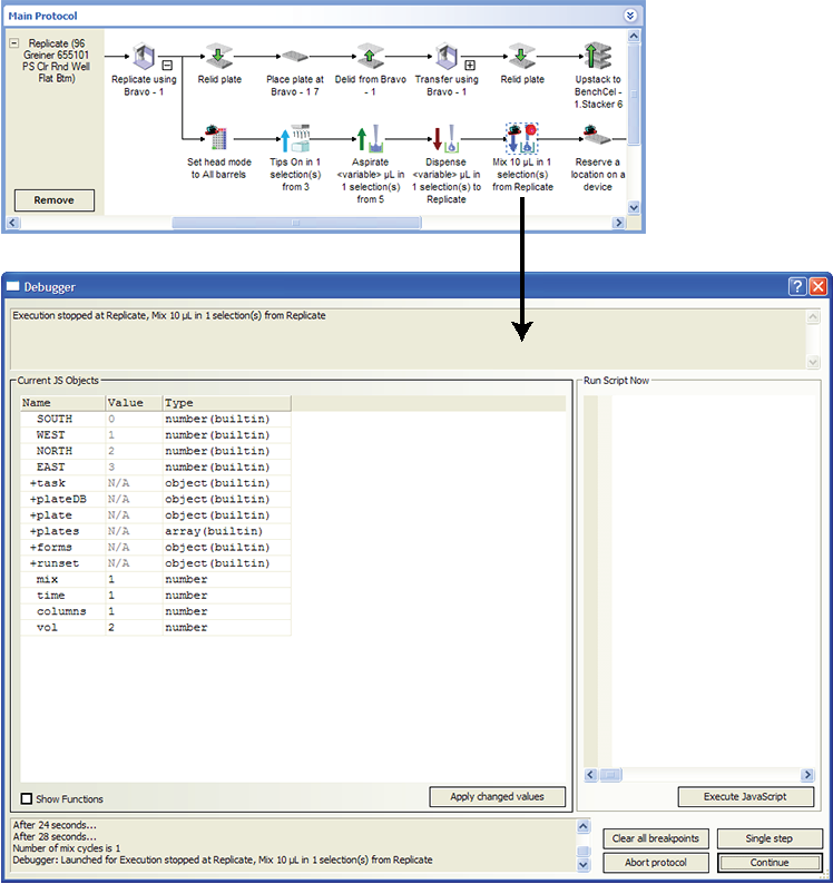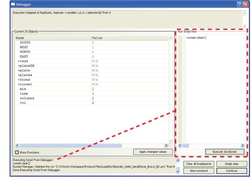 b Click Execute JavaScript.For example, you could type the script runset.clear()to clear all the entries in the runset manager, except for currently running protocol.