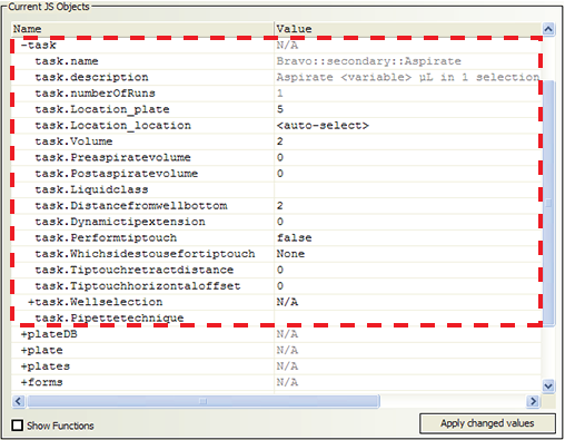 3 In the Value column, change a property value, if required. For example, you might change the task.Volume value from 2 to 3.