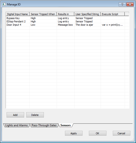• Script. Runs the specified JavaScript when the sensor is tripped. You can specify the script in the Execute Script box.